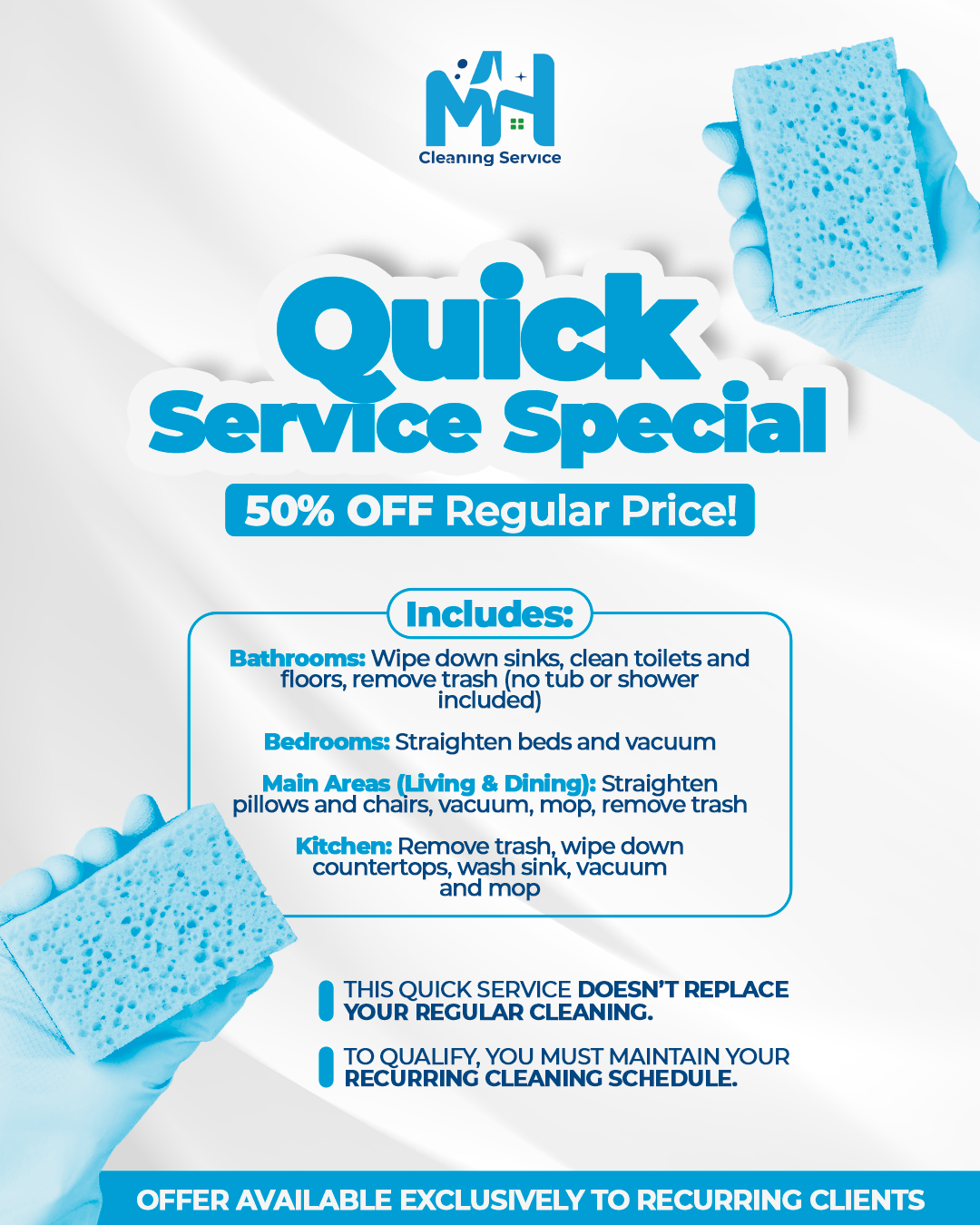 If you currently maintain a regular cleaning schedule, you get 50% OFF regular price on our quick service special!